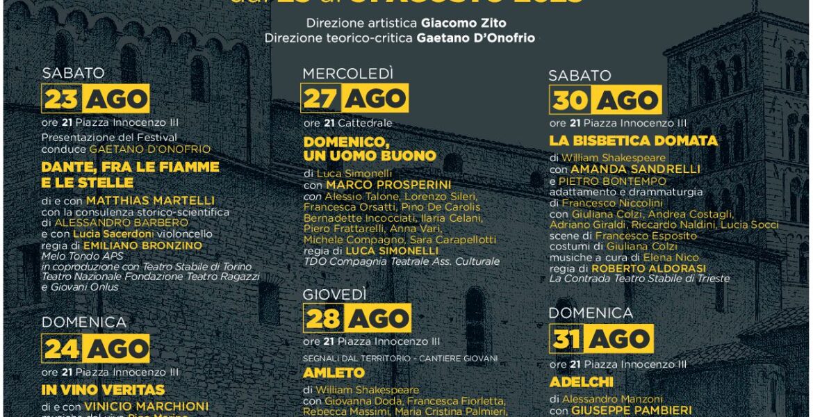 Al via il 23 agosto la XXXII edizione del Festival del Teatro Medievale e Rinascimentale della Città di Anagni, con la messa in scena di “Dante fra le fiamme e le stelle”, spettacolo di e con Matthias Martelli, che animerà dalle 21 la splendida Piazza Innocenzo III, ad ingresso gratuito e libero.