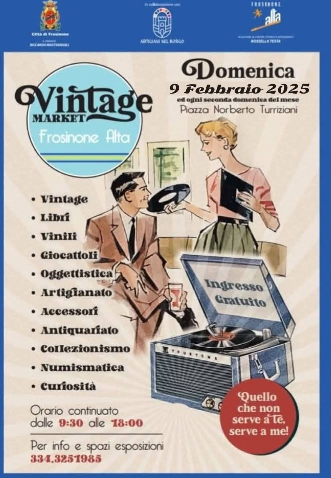 Domenica 9 febbraio, in piazza Turriziani, si terrà il Vintage market “Frosinone Alta”, con orario…