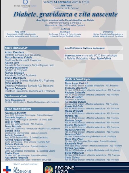 Una tavola rotonda, aperta a tutti, con professionisti dell’endocrinologia, della ginecologia e ostetricia, della pediatria, delle scienze infermieristiche e di tanti altri ambiti del mondo sanitario per parlare del diabete mellito e del rapporto di questa patologia con la gravidanza e la vita che nasce. L’iniziativa, in occasione della Giornata Mondiale del Diabete, si terrà venerdì 14 novembre alle ore 17:00 nella Sala Teatro dell’ASL Frosinone, in via Armando Fabi.