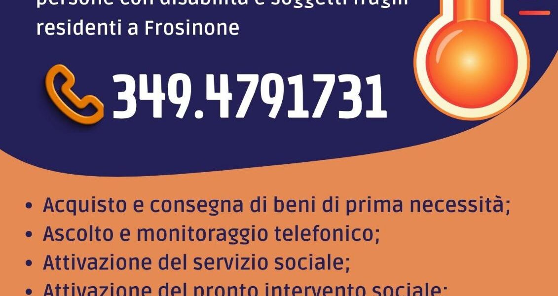 “Per venire incontro alle esigenze delle persone più esposte ai rischi connessi alle alte temperature, che possono determinare situazioni di particolare bisogno nelle fasce più fragili della popolazione – ha dichiarato l’assessore al welfare Alessia Turriziani – è stato attivato un servizio gratuito di assistenza rivolto agli over 65, alle persone con disabilità e ai soggetti fragili residenti a Frosinone, grazie a un ampliamento delle attività comprese all’interno del Pronto Intervento Sociale. Il progetto – ha proseguito l’assessore Turriziani – è volto a garantire attività di supporto e ascolto, scongiurando i rischi derivanti dall’acuirsi dei problemi di salute e di isolamento sociale, caratterizzato non solo dalle particolari condizioni climatiche ma anche dall’assenza di familiari, fornendo informazioni e consigli per limitare il disagio causato dal calore e garantendo, su richiesta, l’acquisto e la consegna di beni di prima necessità”.