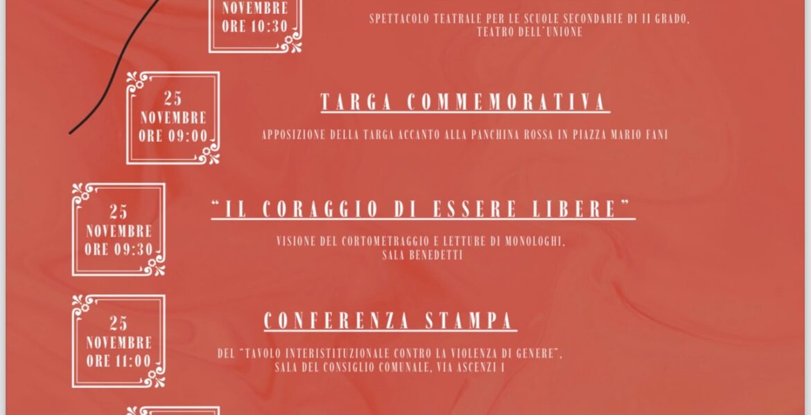 Le iniziative andranno oltre le giornate del 24 e 25 novembre. È infatti in programma per l’11 dicembre alle ore 10, l’inaugurazione di una panchina rossa alla sede dell’assessorato alle politiche sociali e all’educazione, accompagnata da una performance artistica dell’associazione culturale Accademia.