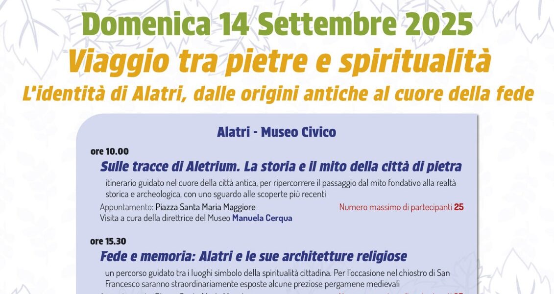 Per l’edizione 2025, sarà proprio Alatri a inaugurare il programma domenica 14 settembre, con una giornata speciale che offrirà al pubblico due itinerari guidati dedicati alla storia e alla spiritualità della città.