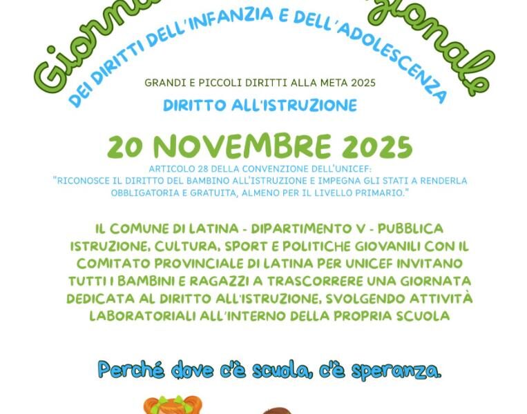 Nel pomeriggio del 20 novembre, inoltre, si terrà nell’aula consiliare del Comune di Latina un incontro pubblico, coordinato dalla consigliera comunale Francesca Pagano, con il Consiglio comunale delle bambine e dei bambini sul tema del diritto all’istruzione.