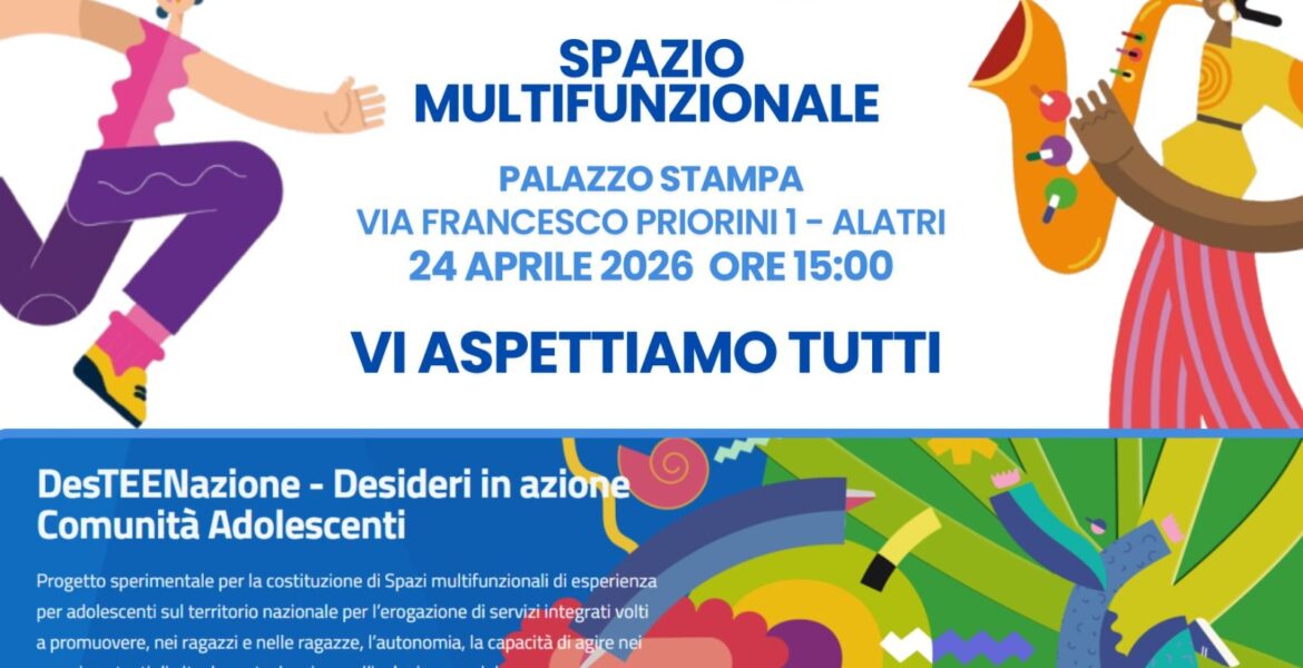 Il 24 aprile 2026, alle ore 15:00, presso Palazzo Stampa, nel centro storico di Alatri. Lo spazio è stato realizzato nell’ambito del progetto DesTEENazione – Desideri in azione- Comunità Adolescenti.