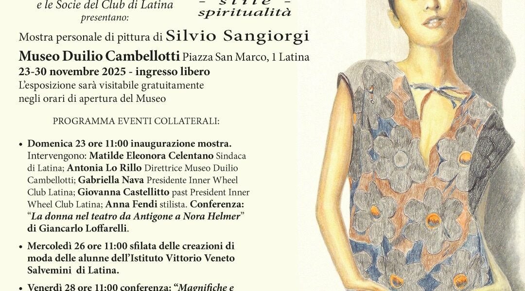 “In compagnia della donna: bellezza, stile e spiritualità” è il titolo della personale di pittura di Silvio Sangiorgi. L’esposizione della mostra, organizzata da Inner Wheel Club di Latina – Distretto 208 Italia e patrocinata dal Comune di Latina, avrà luogo al “Cambellotti” dal 23 al 30 novembre 2025, a cura della direttrice del museo Antonia Lo Rillo.