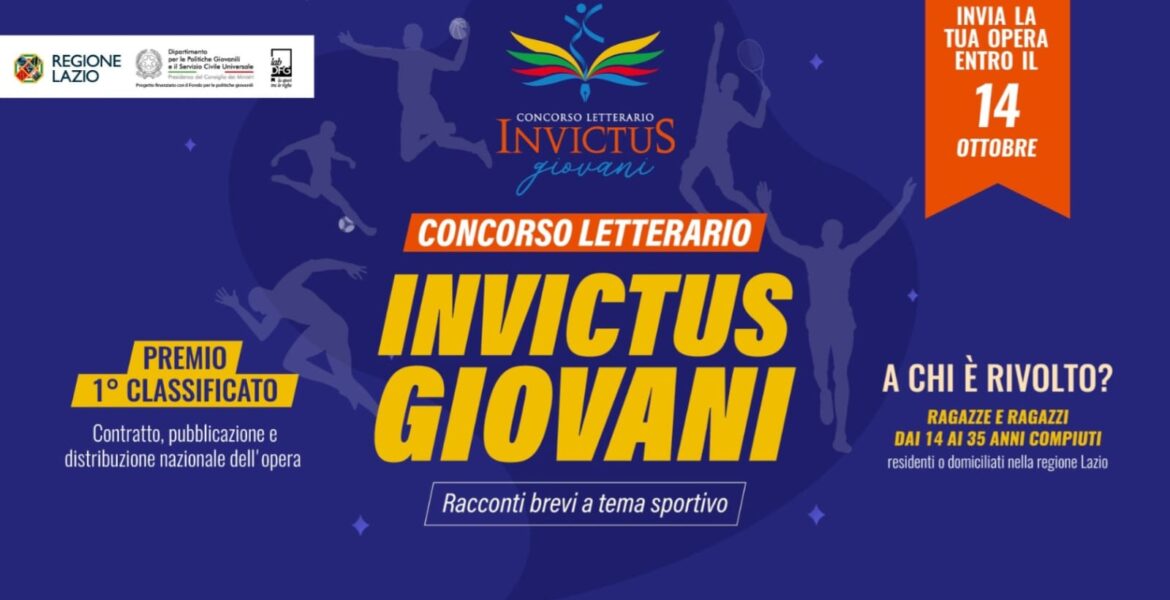 La Regione Lazio, assieme a Lazio Innova, lancia “Invictus Giovani”, il primo concorso letterario dedicato a racconti brevi sul tema dello sport, pensato per valorizzare la creatività delle nuove generazioni e riservato a scrittrici e scrittori tra i 14 e i 35 anni residenti o domiciliati nel Lazio.