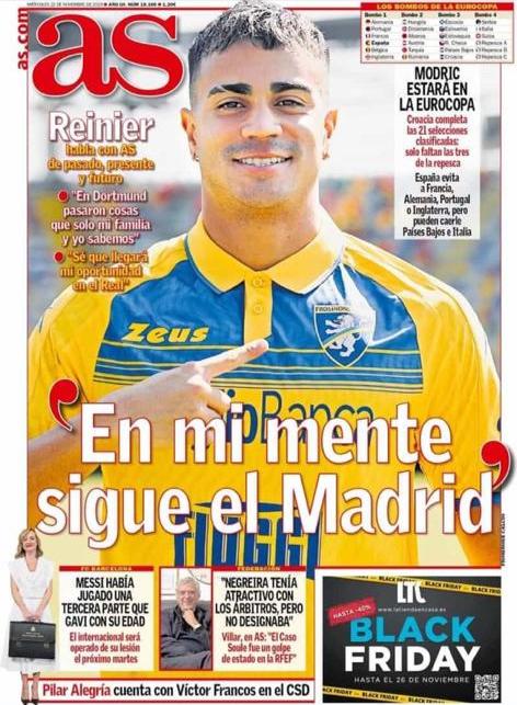 Le soddisfazioni per il club ciociaro non finiscono qui. Il brasiliano Reinier, di proprietà del Real Madrid ed in prestito al Frosinone, si è infatti guadagnato la copertina di “As”, uno dei quotidiani sportivi più importanti di Spagna. Nella bella intervista a firma di Mirko Calemme, il talento verdeoro che indosserà fino a giugno la maglia giallazzurra, è effigiato a tutta pagina con i suoi nuovi colori e racconta le sue aspirazioni, i suoi sogni, ma anche la bella realtà del momento, in una squadra e in una città che già hanno imparato, ricambiate, ad amarlo.